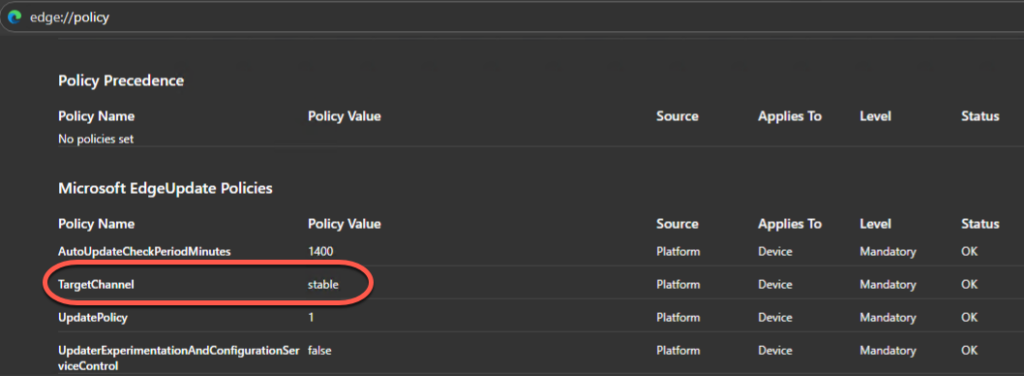 First, here is the policy that is used in my environment to control Edge channel versions.