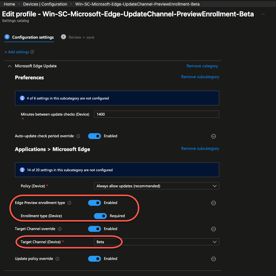 Win-SC-Microsoft-Edge-UpdateChannel-PreviewEnrollment-Beta – This is assigned to the PreviewEnrollment group